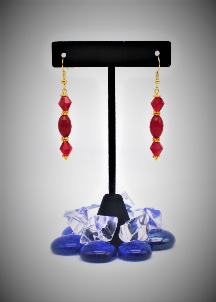 These elegant French wire earrings with deep red stone and crystal Glass bicone shaped beads beautiful. There are exquisite in how the gold-plated daisy spacers allow the different colors in the red beads shimmer.