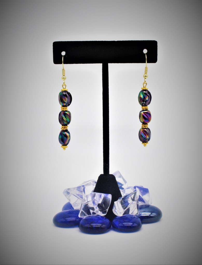 These dashing French wire earrings with multi color oblong shaped purple ceramic beads are magnificent. They are exquisite in how the gold-plated daisy spacers allow the different colors in the purple beads sparkle.