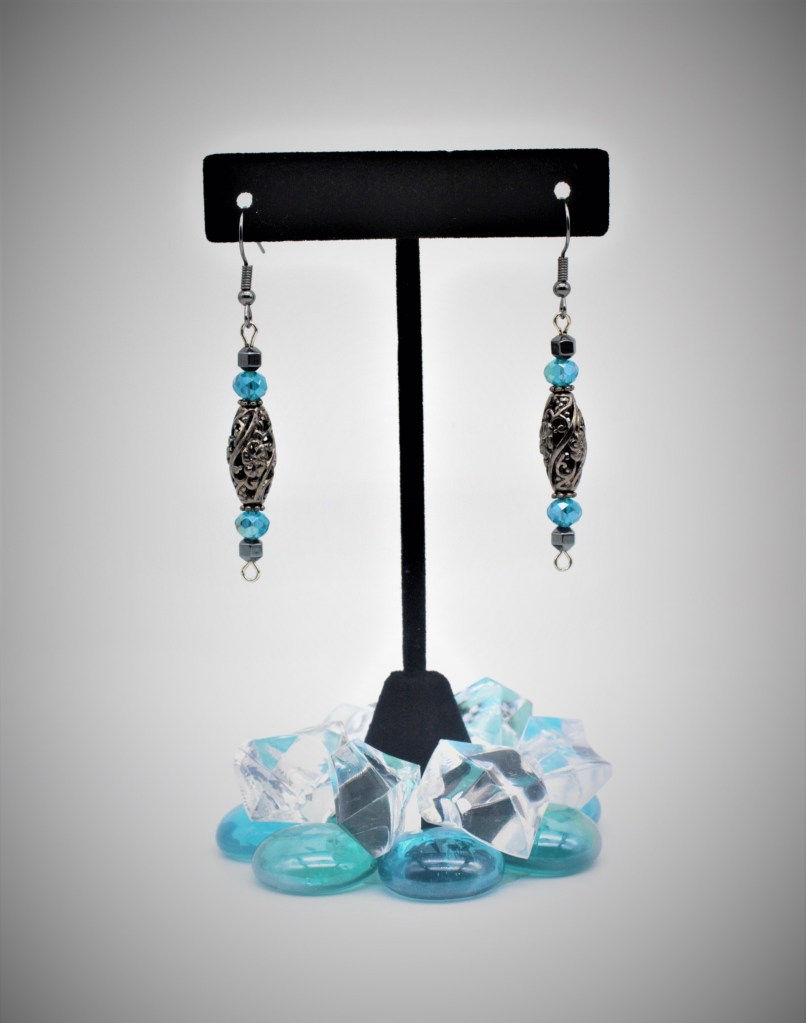Oblong Gun Metal Filigrees with Ocean blue Rondelle and Hematite beaded Earrings.
