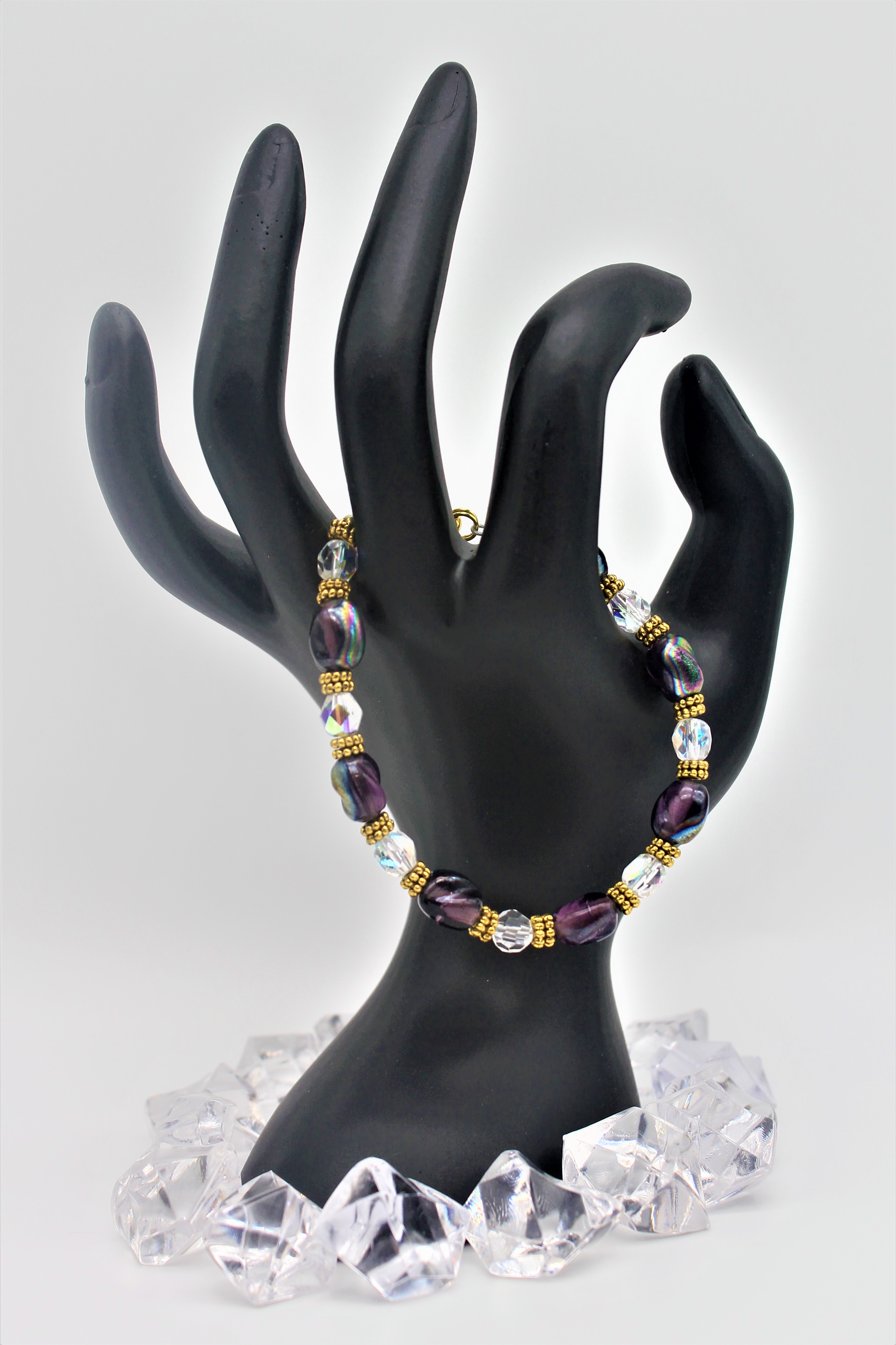 This magnificent, purple glazed ceramic beaded bracelet would be a great addition to anyone’s collection. With its clear rondelles and daisy spacers and the convenience of the (GP) gold-plated magnetics clasp makes it a gorgeous and practical find.