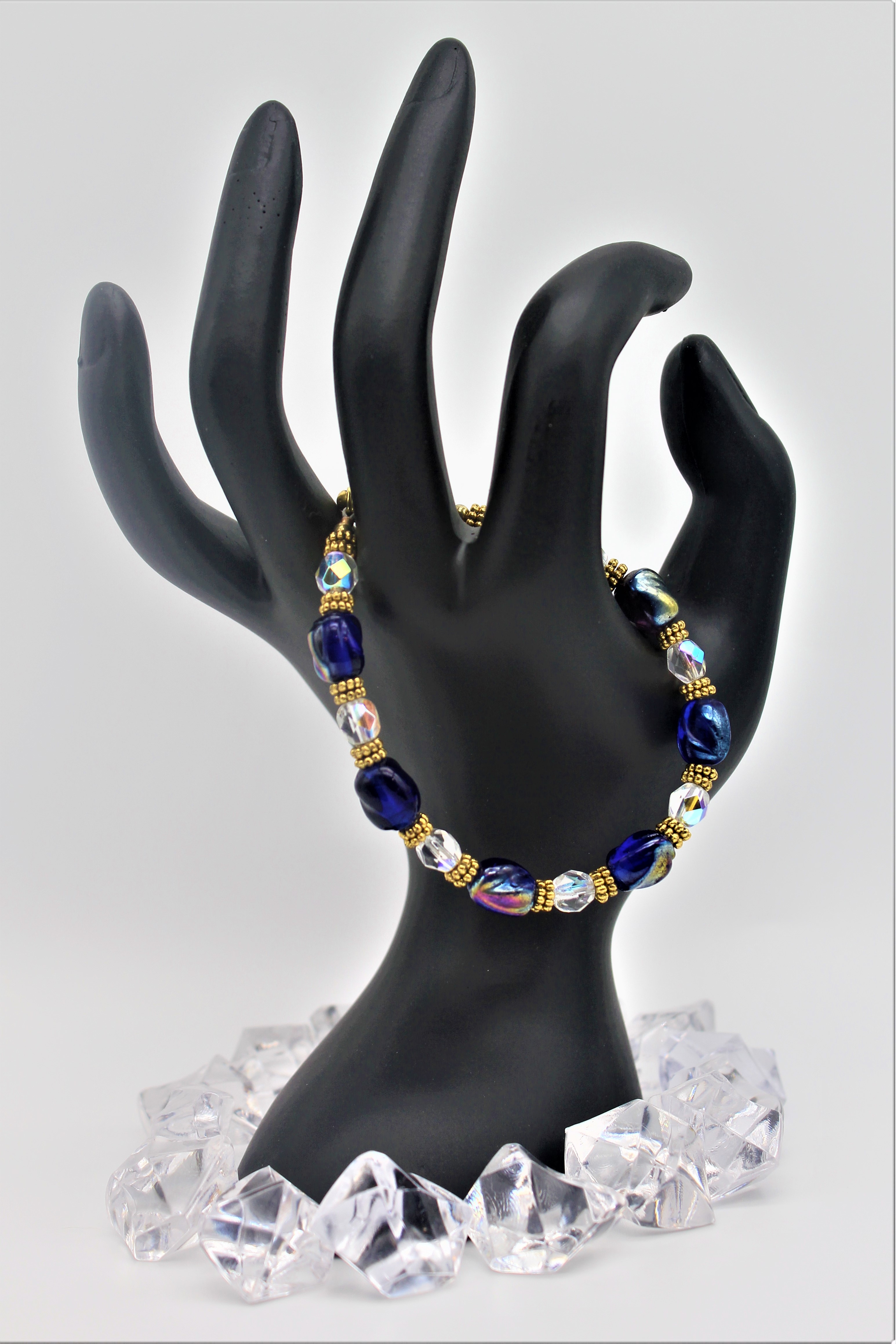 This captivating, royal blue glazed ceramic beaded bracelet would be a great addition to anyone’s bracelet collection. With its clear rondelles and (GP) gold-plated daisy spacers and magnetics clasp which makes it a stunning piece.