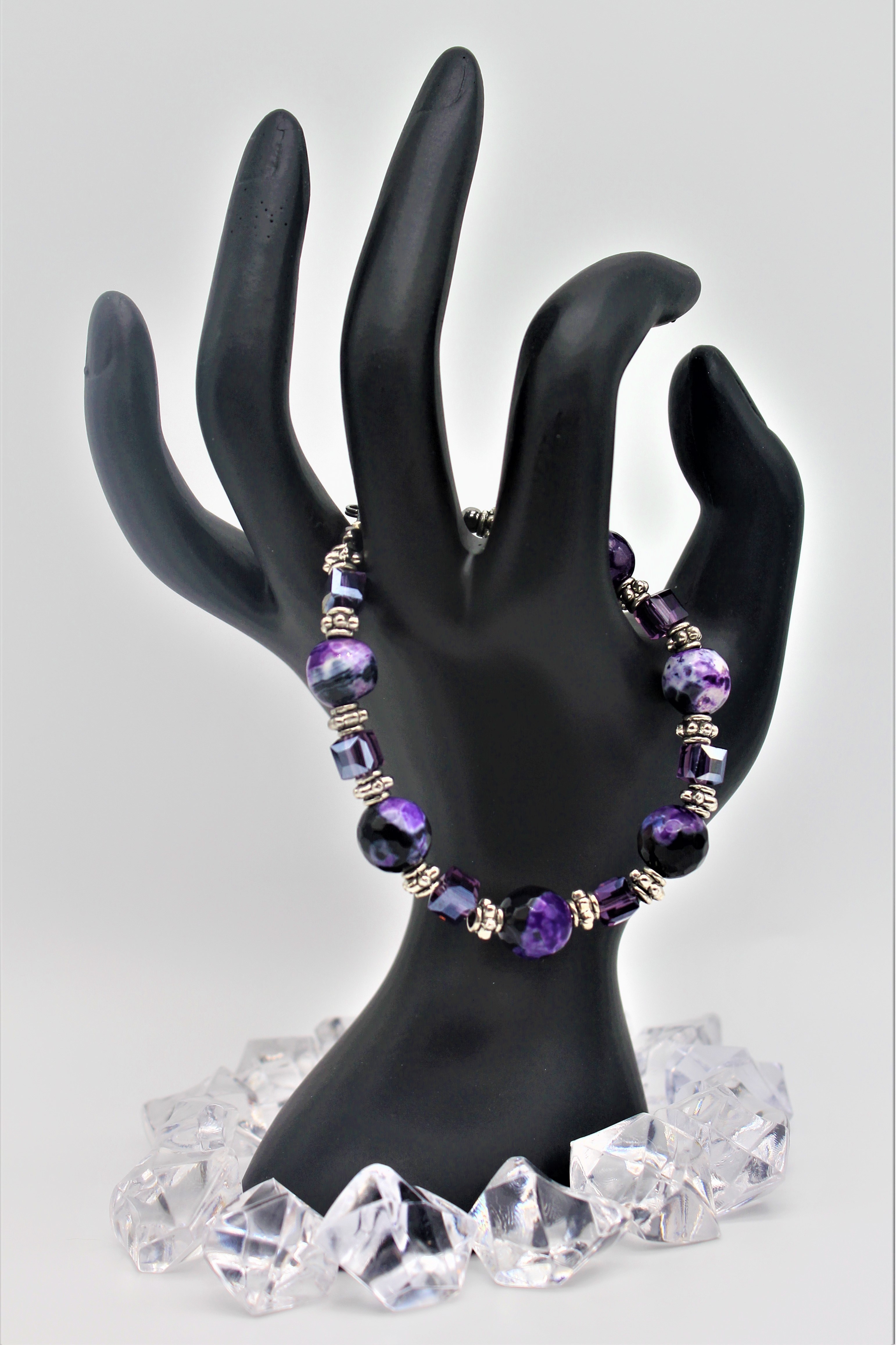 This magnificent black, purple and white agate gemstone bracelet would be a great addition to anyone’s collection. With its purple translucent square glass and (ASP) antique silver-plated spacers and having a gun-metal magnetics clasp makes it pragmatic and captivating at the same time.