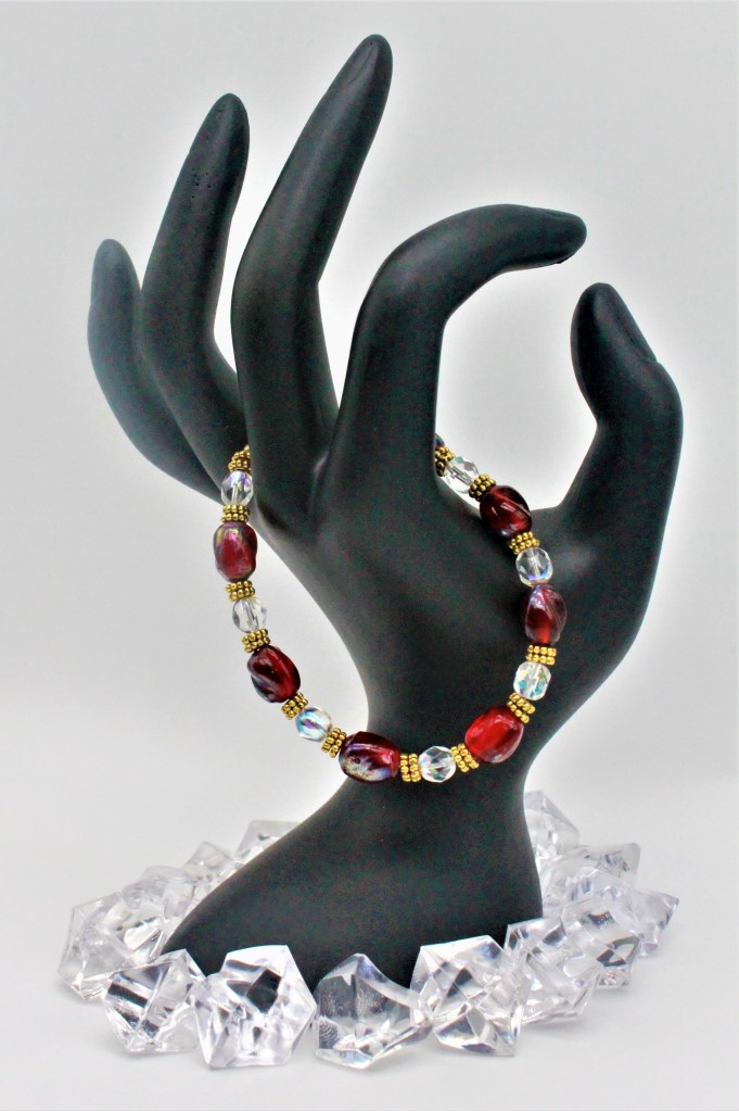 This captivating, red glazed ceramic beaded bracelet would be a great addition to anyone’s collection. With its clear rondelles and (GP) gold-plated daisy spacers with its magnetics clasp are stimulating.