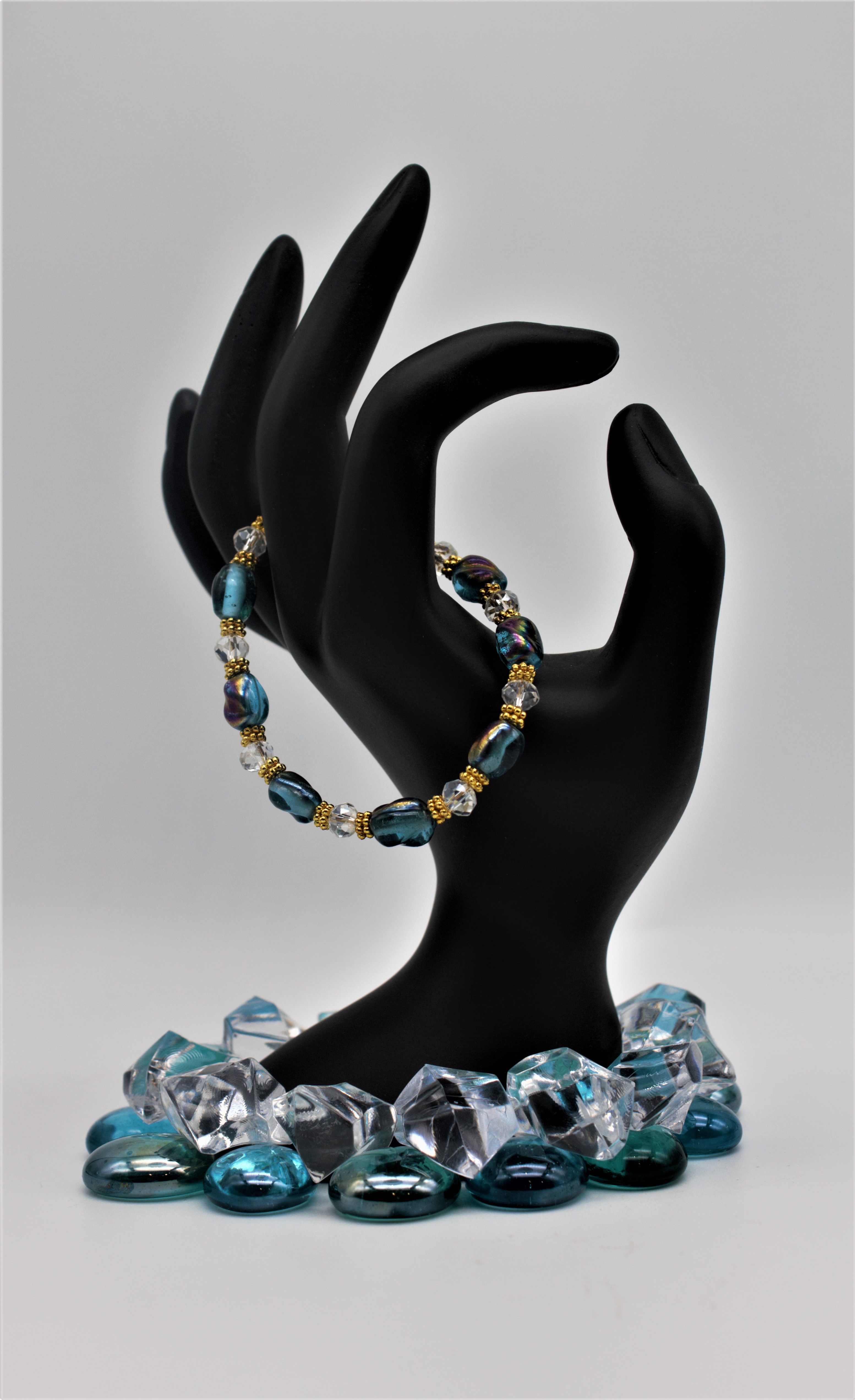 This exquisite teal blue ceramic beaded bracelet with its clear rondelle glass beads and daisy spacers is amazing. With the way the teal blue glistens beside the gold-plated spacers magnetic is breathtaking.