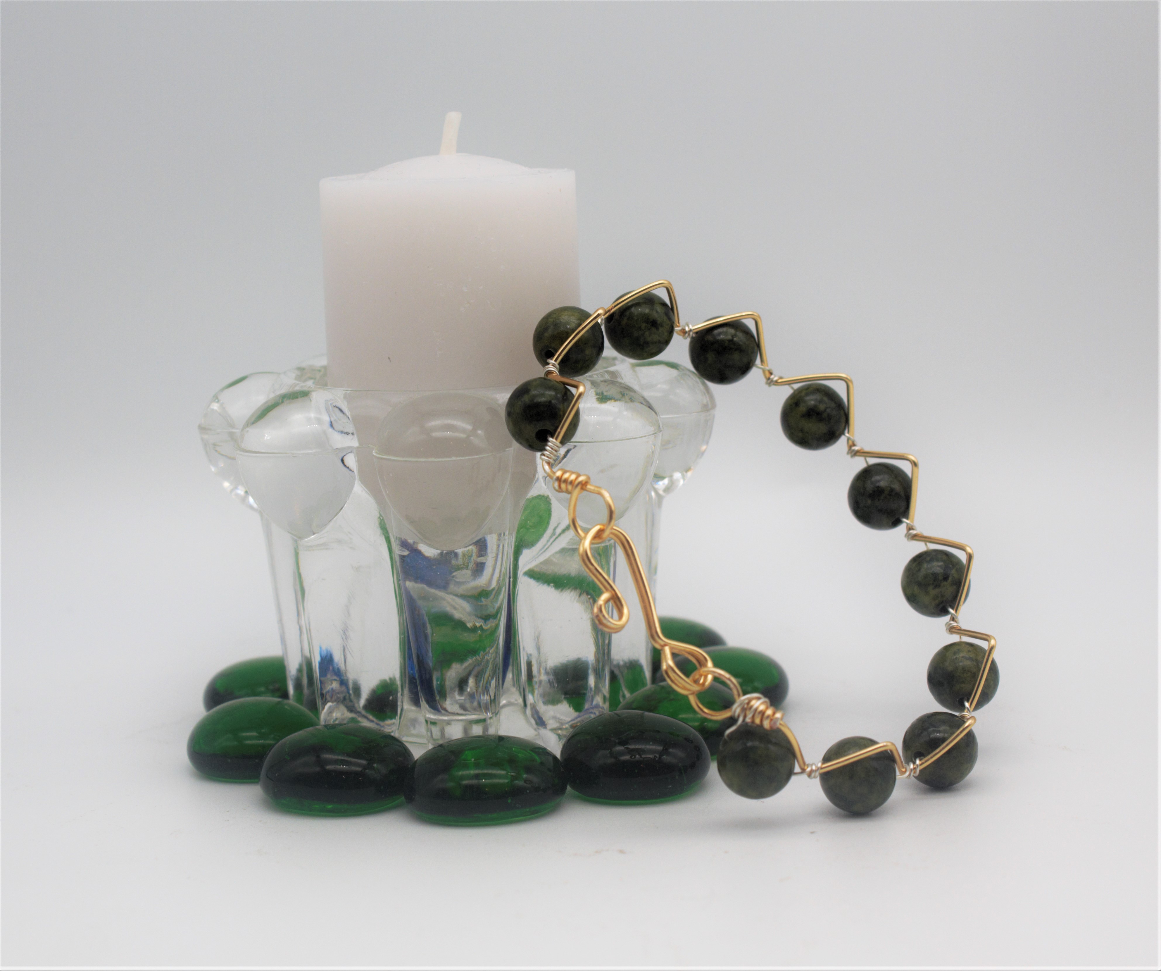 This engaging, 20-gage tarnish resistance gold / copper wire with 24 gage silver wire holding in place the round, dark green jasper beads with a Hook-and-eye clasp is an impress find. The bracelets unusual shape and placement of the beads makes it unique.